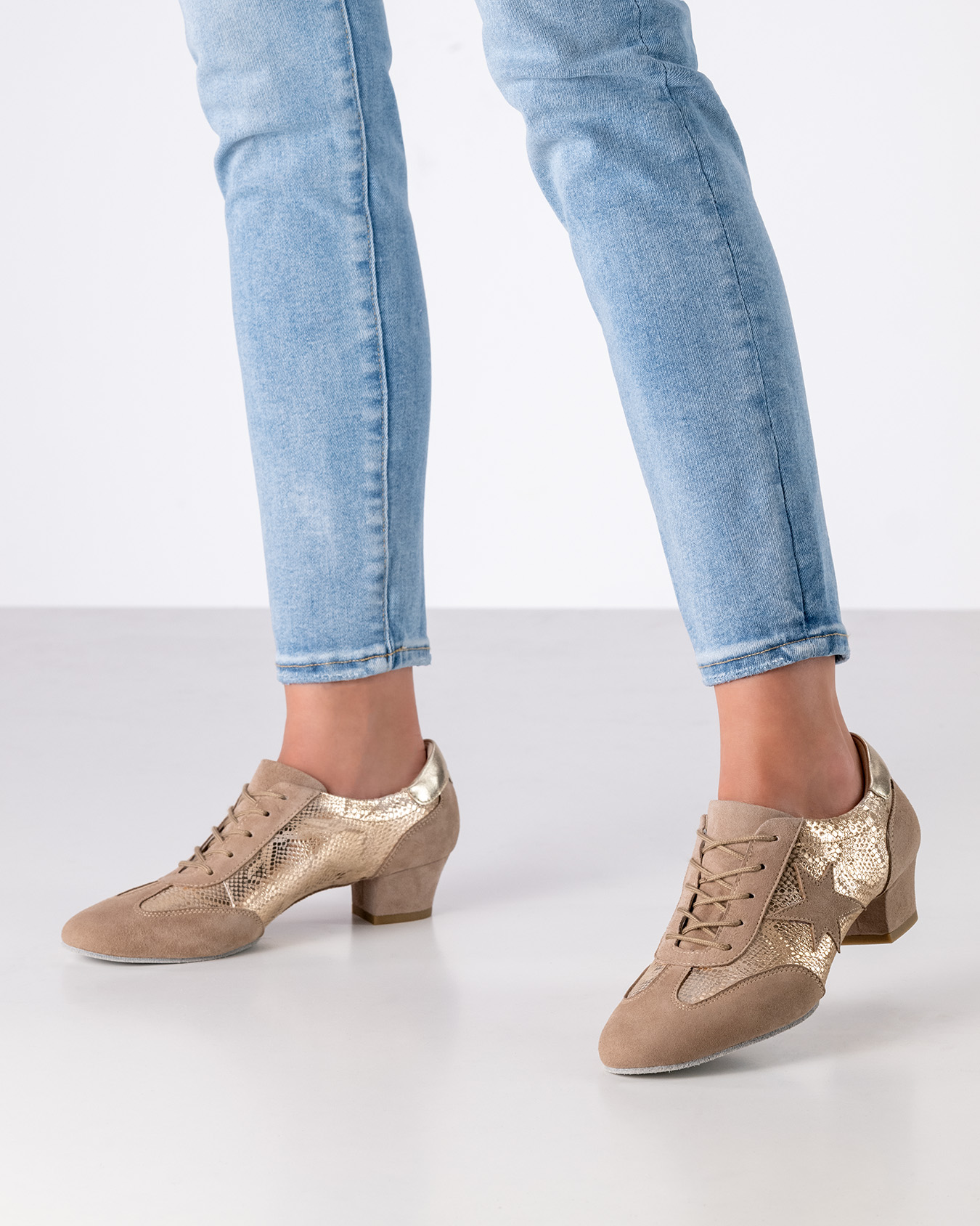 Sie möchten mit sicherem Halt und trotzdem genug Flexibilität über das Parkett gleiten? Dann ist Ariana von Werner Kern genau das richtige. Ein fantastisch bequemer Trainingsschuh mit eleganter Ausstrahlung. Das Zusammenspiel aus weichem Velourleder in Beige und schimmerndem Printleder in Platin verleiht dem Modell eine moderne Optik. Die geteilte Sohle sorgt für maximale Bewegungsfreiheit, während der 3,5 cm hohe, schockabsorbierende Absatz sicheren Stand und angenehme Dämpfung bietet. Ariana verbindet sportliche Funktion mit stilvollem Design.