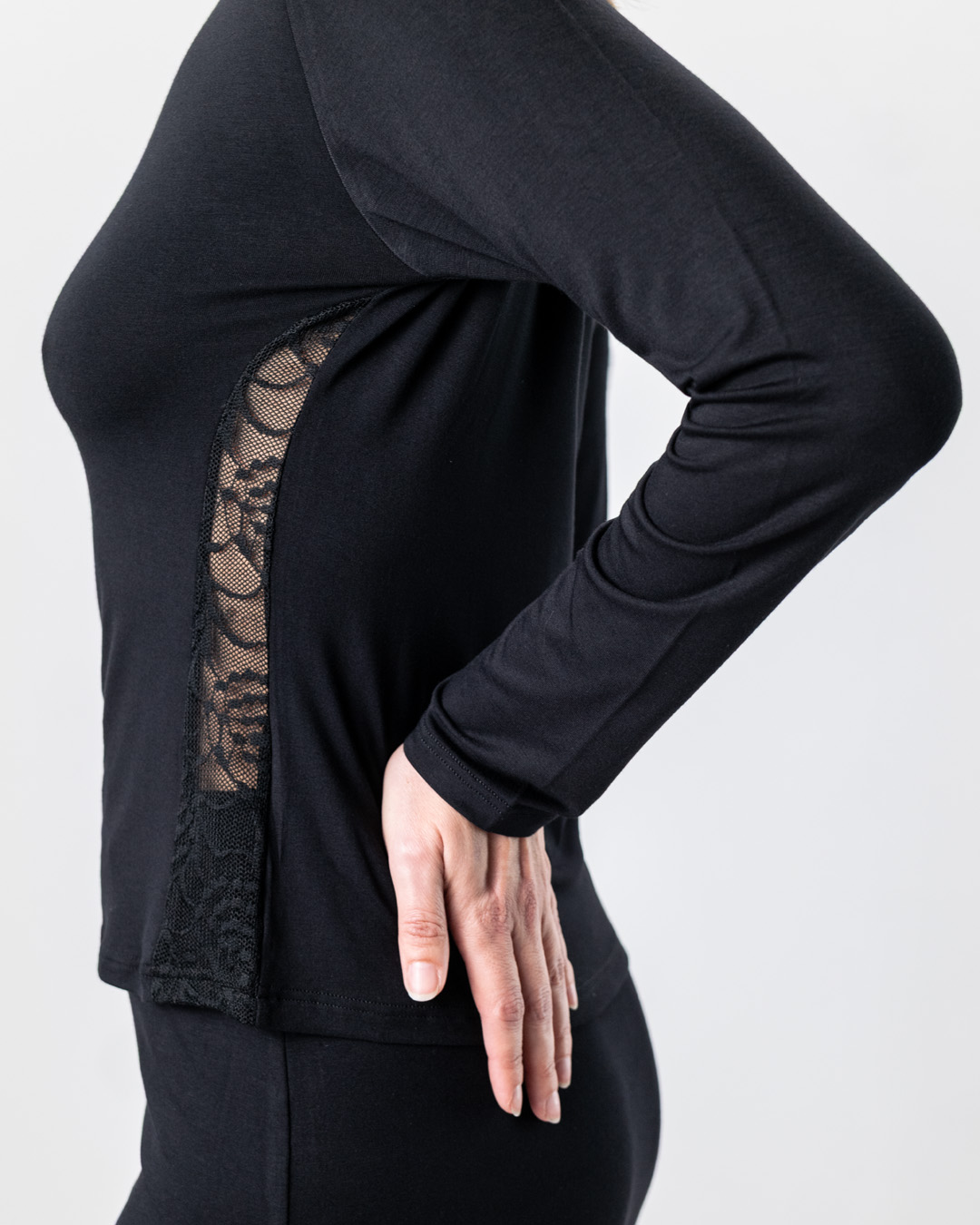 Damen Tanzoberteil Phila in Schwarz mit Spitzendetail – für Tango, Bachata, Standard und Co. Das tailliert geschnittene Tanzoberteil Phila in klassischem Schwarz überzeugt mit einem eleganten U-Boot-Ausschnitt und einem dezenten Spitzeneinsatz in der linken Seitennaht – für eine stilvolle, feminine Ausstrahlung auf der Tanzfläche. Der körpernahe Schnitt schmeichelt der Figur, während das elastische Material für maximale Bewegungsfreiheit sorgt. Dieses schwarze Tanzoberteil ist ideal für leidenschaftliche Tänze wie Tango, Kizomba oder Bachata. Perfekt kombinierbar mit dem Rock Tyra mit dezentem Spitzendetail und elegantem Frontschlitz. Für besonders bewegungsintensive Tanzstile, bei denen noch mehr Beinfreiheit gefragt ist, empfehlen wir unsere Tanzröcke Orla oder Vana.
